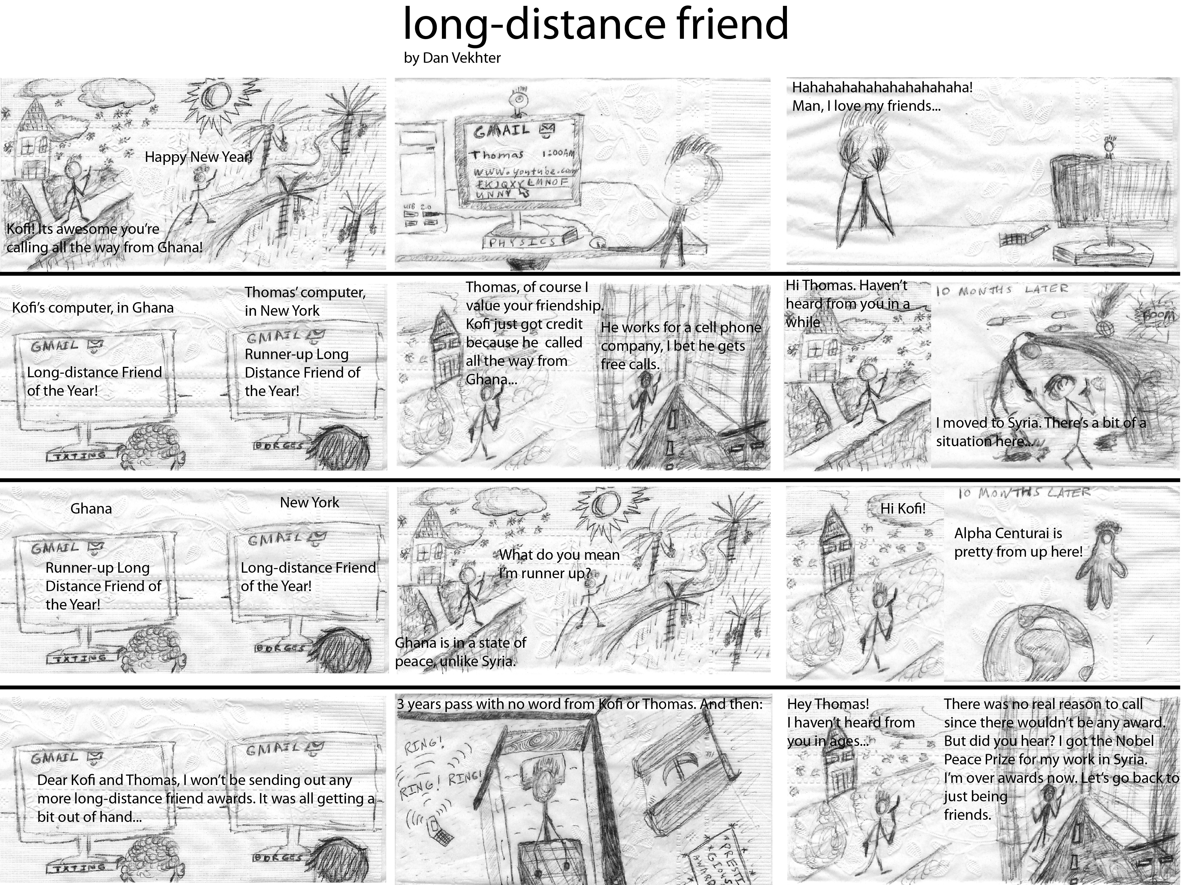 Long-Distance Friend (a comic – click on the image to see the full-size version) danscreativeoutlet Uncategorized March 26, 2012March 26, 2012 1 Minute Share this: Click to share on X (Opens in new window) X Click to share on Facebook (Opens in new window) Facebook Like Loading... Related Published by danscreativeoutlet doodler, wonderer, neurologist, nature lover View all posts by danscreativeoutlet Published March 26, 2012March 26, 2012