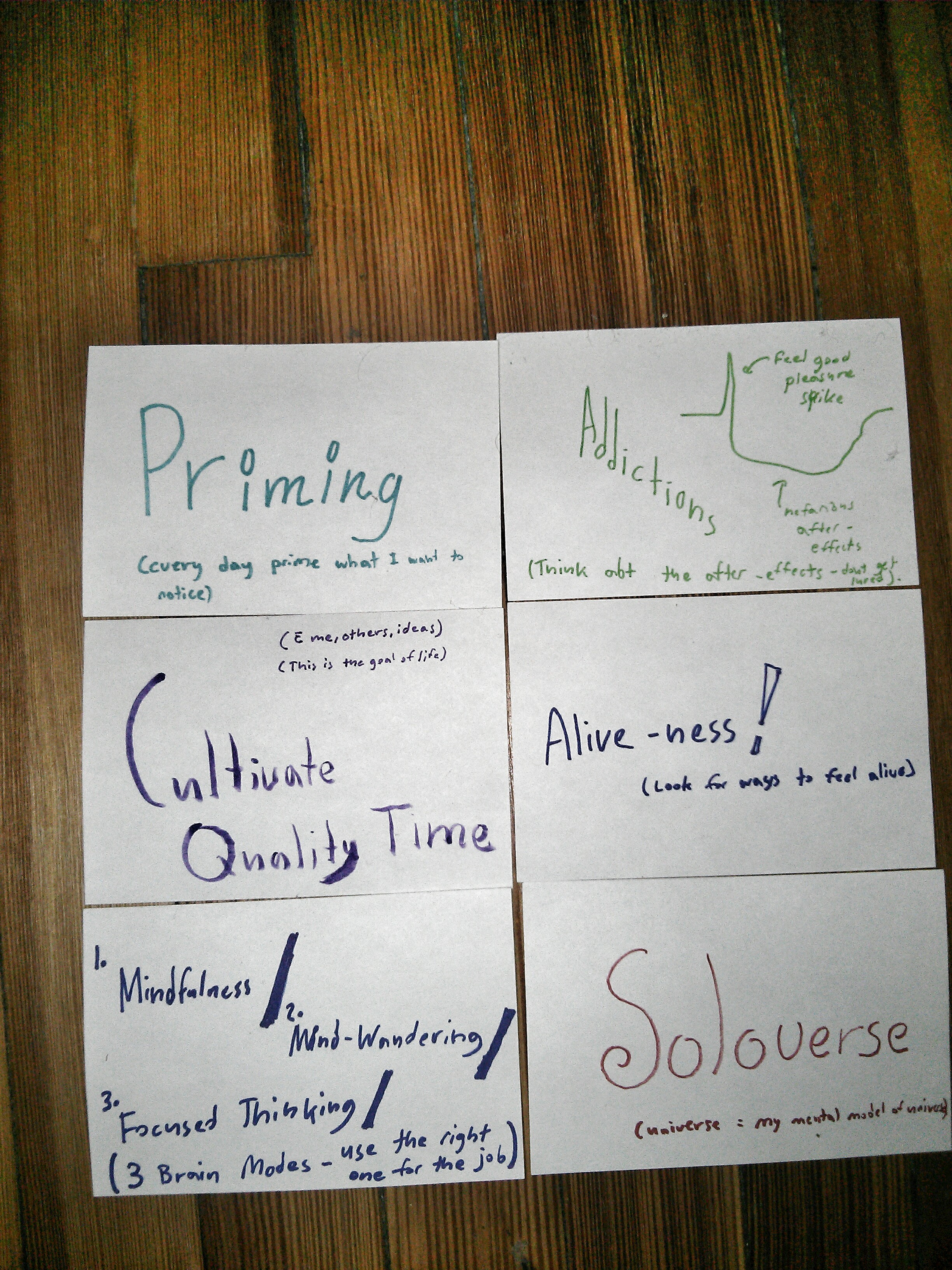 Above is a picture of the 6 ideas I’m experimenting with revisiting each morning, on index cards by my bed (a few of these were stolen from Benson):